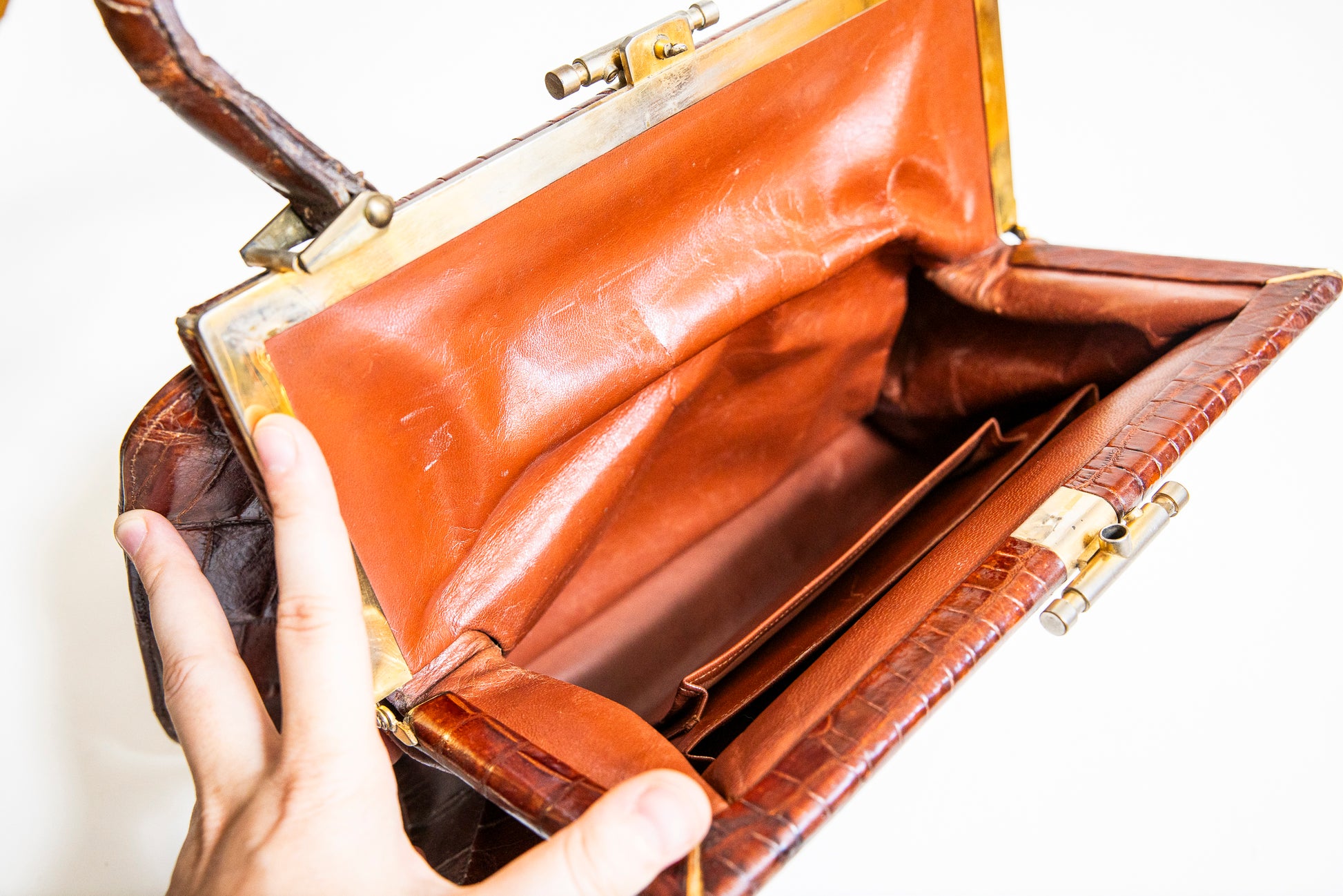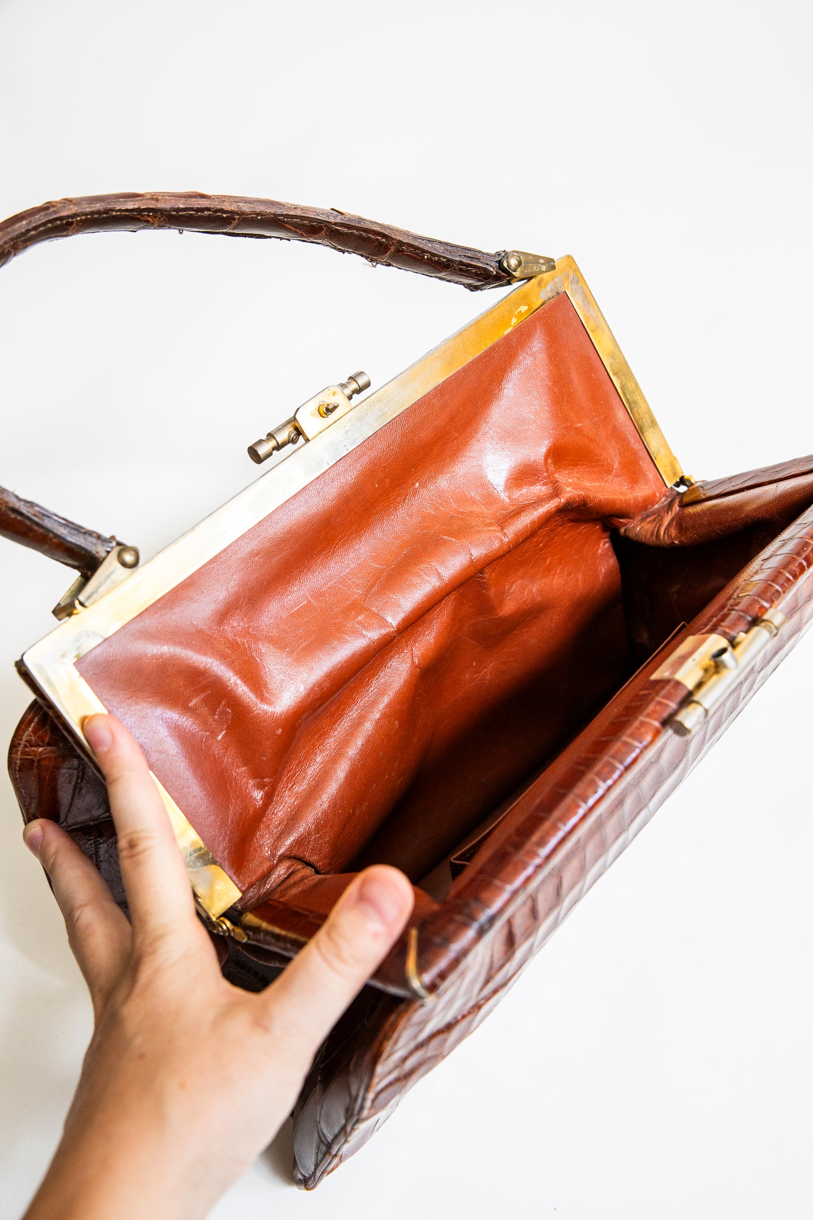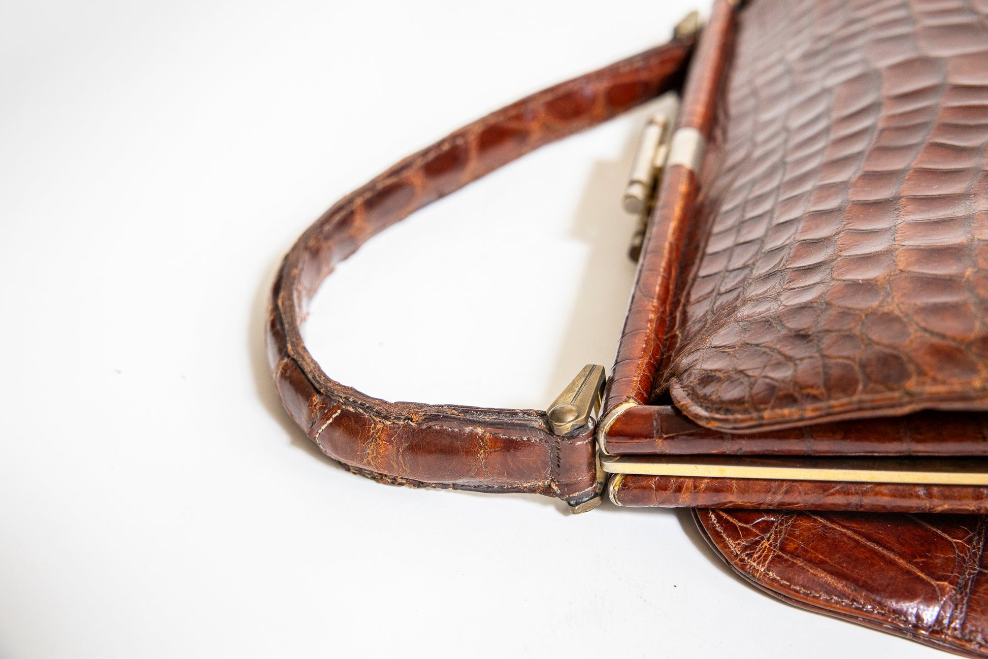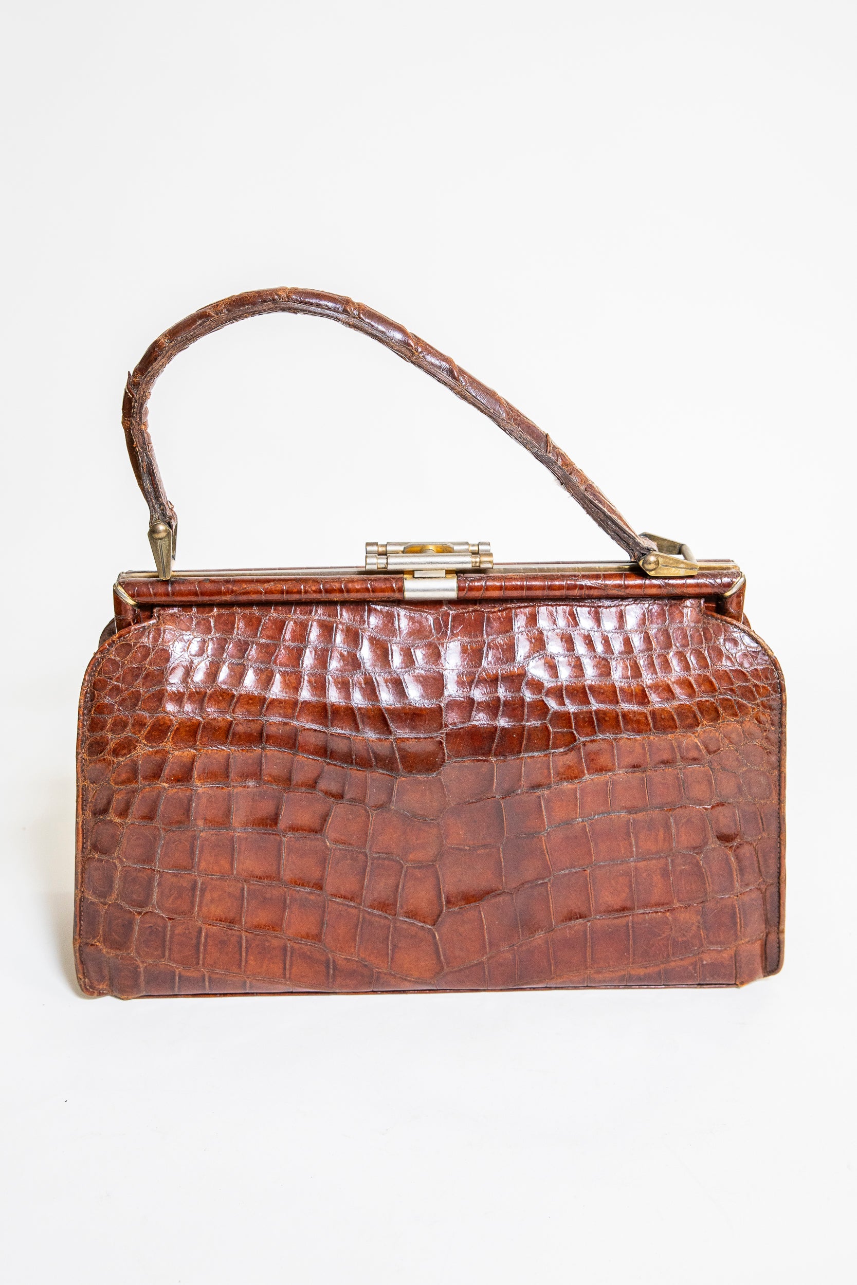 Brown handbag made of natural croc leather with bronze hardware. The leather is well-maintained and moisturized. Presumably it is 1940's vintage.